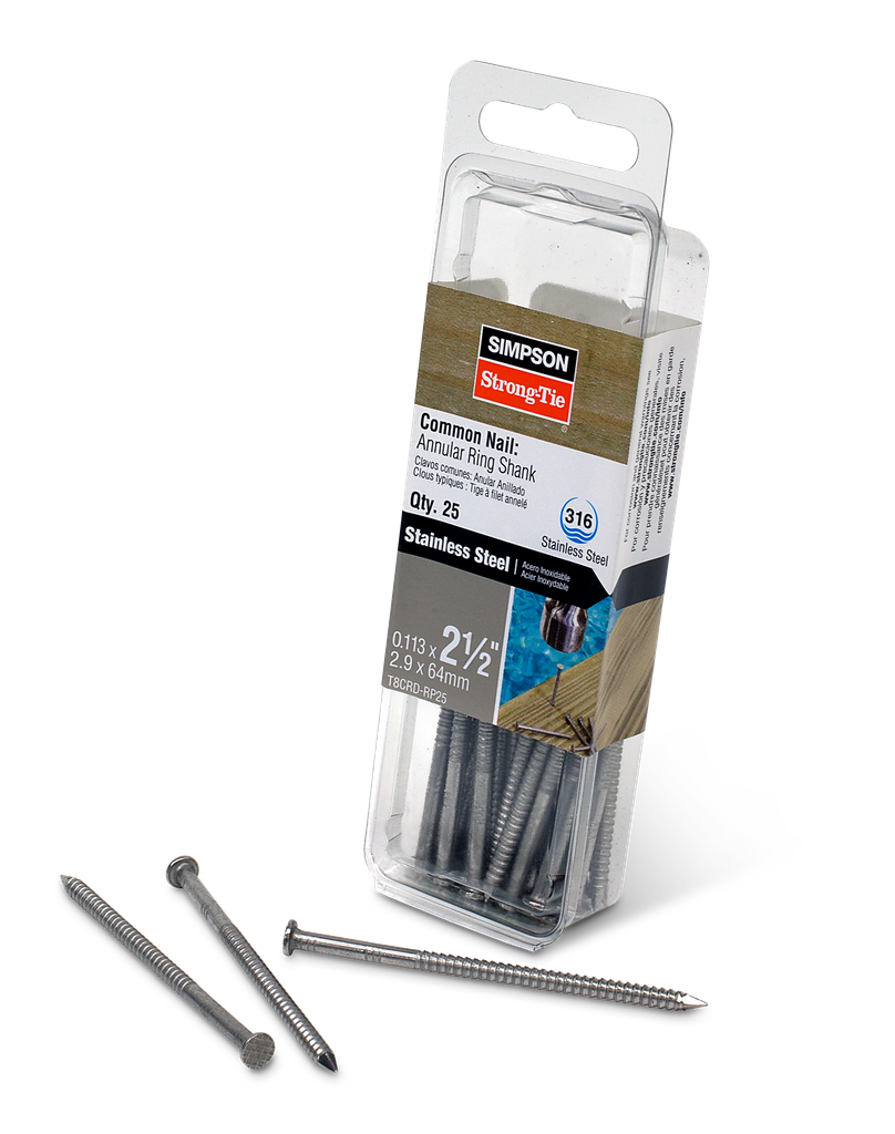 Simpson Strong-Tie offers a wide variety of fasteners to meet the requirements for every project type. Our exterior nails provide powerful, corrosion-resistant fastening solutions to help make your outside living space as long lasting as the interior of your home. The cedar and redwood decking nail is specifically designed for use in cedar and redwood decking projects and features an annular ring shank for increased withdrawal resistance. The small and compact head of this deck nail has a checker pattern that blends well with wood grain.