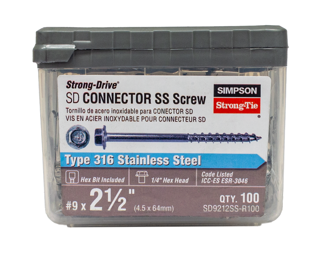 Constructed for reliability and versatility, the SD9212SS-R100 Strong-Drive® SD Connector Screw from Simpson Strong-Tie is an exceptional choice for various connector applications. These #9 x 2-1/2-inch screws feature a unique 1/4-inch hex head with an integrated washer, effectively reducing cam-out during installation and stamped for easy identification post-application. Made from Type 316 stainless steel, they offer robust corrosion resistance, making them suitable for both interior and exterior environments, even under harsh conditions. Designed to replace traditional 10d nails, these screws enhance control while fastening, especially in tight or delicate settings where the use of a hammer may not be practical. Each package contains 100 screws, ensuring you have plenty on hand for your construction projects while also being compatible with many of Simpson Strong-Tie’s popular connectors.