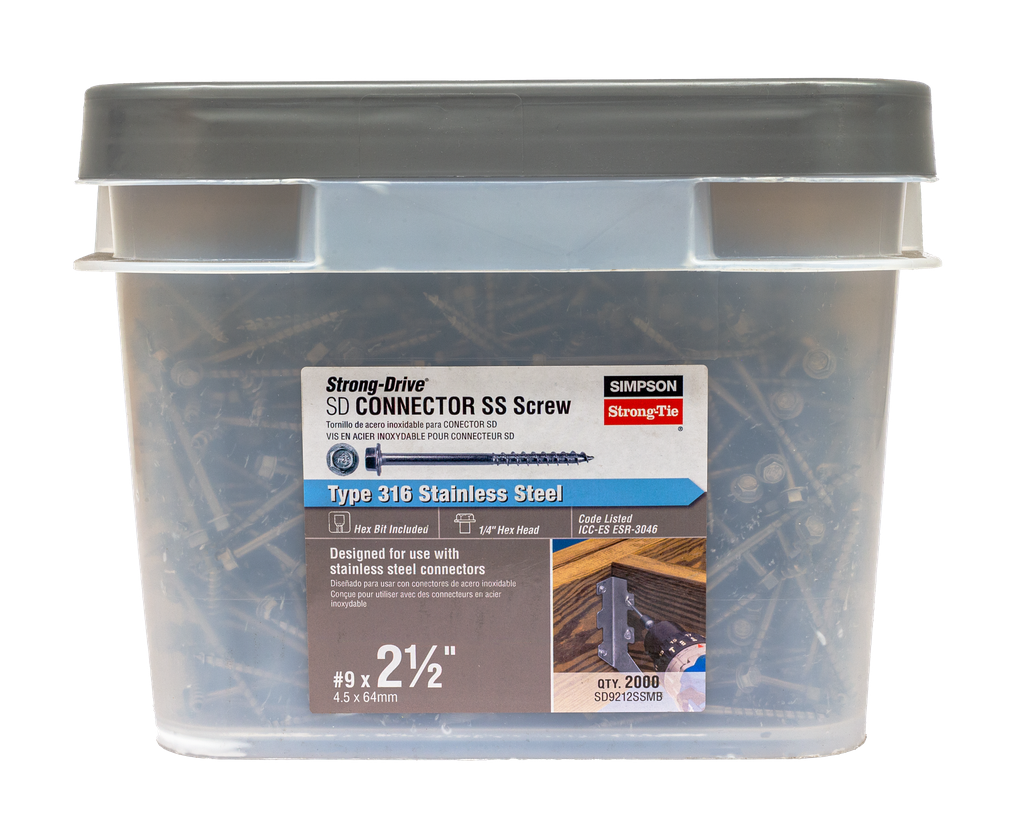 The stainless-steel Strong-Drive SD Connector SS screw (SD SS) is specifically designed to replace nails in certain Simpson Strong-Tie® stainless-steel connectors. The load-rated SD SS screw has been tested and approved for use in many popular Simpson Strong-Tie products. In certain applications screws are easier and more convenient to install than nails, and the single-fastener load values achieved by the SD SS screw exceed those of typical 10d common nails. In addition, the Type 316 stainless steel provides excellent corrosion resistance appropriate for severe-exposure environments.