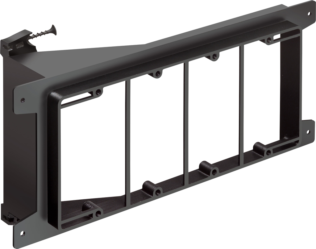 Designed for seamless integration in new construction projects, this low voltage mounting bracket from Arlington Industries supports four gang configurations while ensuring sturdy installation onto wood studs. Made from durable plastic, this black bracket not only facilitates the easy anchoring of low voltage cables with its built-in loop for tie-off but also maintains compliance with UL and CSA listings for added safety and reliability. Ideal for electricians and contractors, the screw-on style offers a reliable solution for a neater finish to wiring tasks, providing a secure and organized setup that meets the demands of modern electrical installations. This product is available in packs of ten, making it a practical choice for bulk purchasing on job sites.
