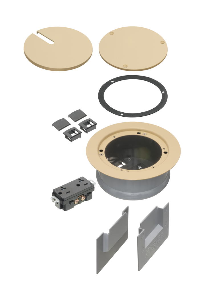 Engineered for seamless integration into flooring, this ultra-thin, stamped steel flange cover with a light almond powder-coated finish offers a refined solution for managing electrical and low voltage needs. With two low voltage openings, it accommodates both keystone holder inserts and blank inserts, providing flexibility for various configurations. The kit includes a tamper-resistant 20A decorator-style receptacle, ensuring safety and reliability, along with a blank cover equipped with a gasket and an in-use slotted plug cover for a neat appearance. Designed for practicality, its flush-to-floor aesthetic not only maintains the room’s integrity but also contributes to a cleaner, more organized space.
