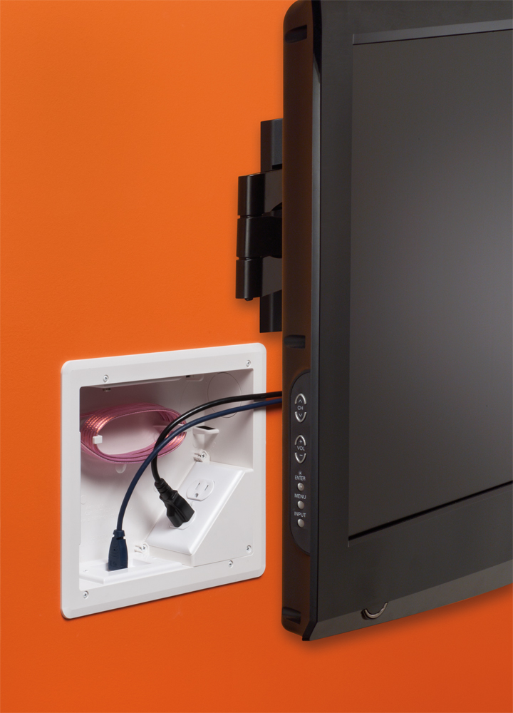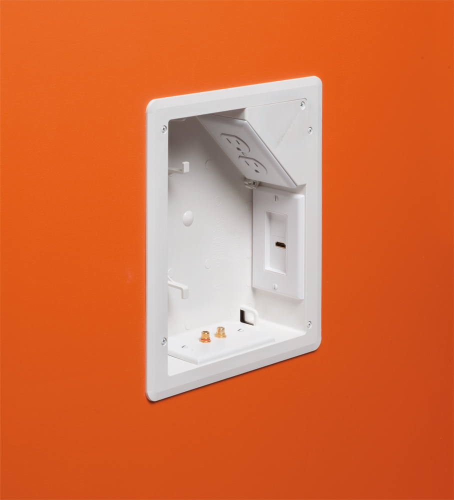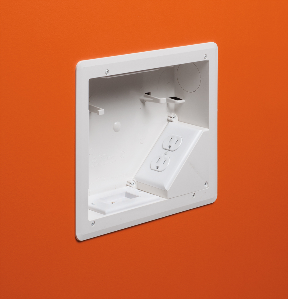 8 x 10 Plastic TV BOX BRIDGE kit. Includes line voltage box, duplex receptacle. 1-1/2″ knockout, cable entry device, wire management brackets. For new and old construction.