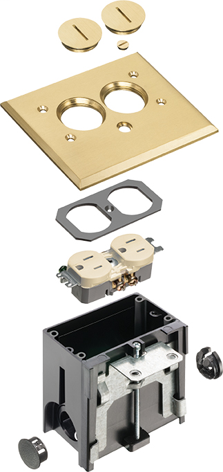 Offering a durable and versatile solution for modern electrical installations, this adjustable metallic floor box by Arlington Industries features a beautifully crafted brass cover complemented by threaded plugs. Designed specifically for new floor construction, it includes a tamper-resistant duplex receptacle, ensuring safety and compliance in various settings. The floor box is constructed from sturdy plastic, while its rectangular metallic cover adds a touch of elegance to any environment. Along with the included Arlington NM94 connector and NM900 knockout plug, this adjustable floor box simplifies setup while providing essential functionality for both residential and commercial applications.