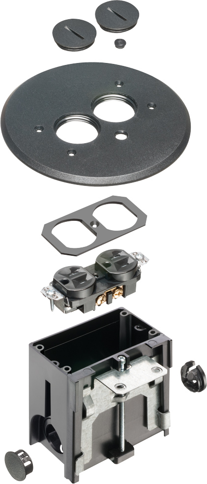This round non-metallic adjustable floor box from Arlington Industries is expertly designed for new floor construction, providing reliable functionality and seamless integration into any setting. Featuring a sleek black cover and equipped with a tamper-resistant duplex receptacle, it ensures safety and convenience in your electrical installations. Additionally, the package includes a cover plate with a gasket, an Arlington NM94 connector, and an Arlington NM900 knockout plug, allowing for versatile usage. Its UL listing gives you peace of mind, making it a solid choice for both residential and commercial projects. With its durable plastic construction and adjustable design, this floor box not only meets practical needs but also complements modern aesthetic requirements.