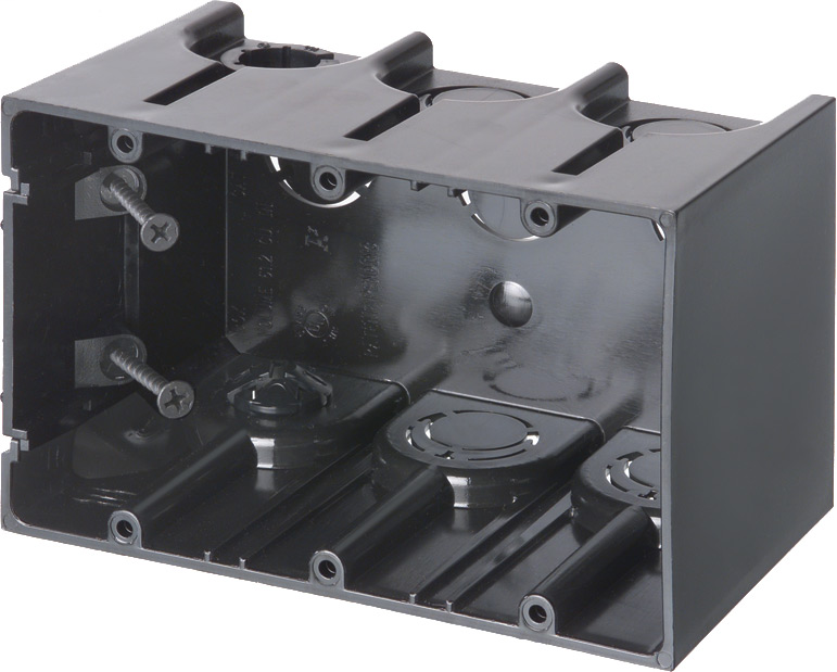 Designed with versatility in mind, this three-gang outlet box from Arlington Industries offers a reliable solution for your electrical needs. Constructed from durable plastic, these non-metallic boxes provide ample cubic space of 61.0 cubic inches, making them ideal for accommodating multiple wiring connections in a neat and organized manner. Featuring a sleek black finish and a vertical design, they not only ensure functionality but also blend seamlessly into various settings. These outlet boxes are UL listed for safety and can be acquired with an optional grounding clip, enhancing their adaptability for different installation preferences.