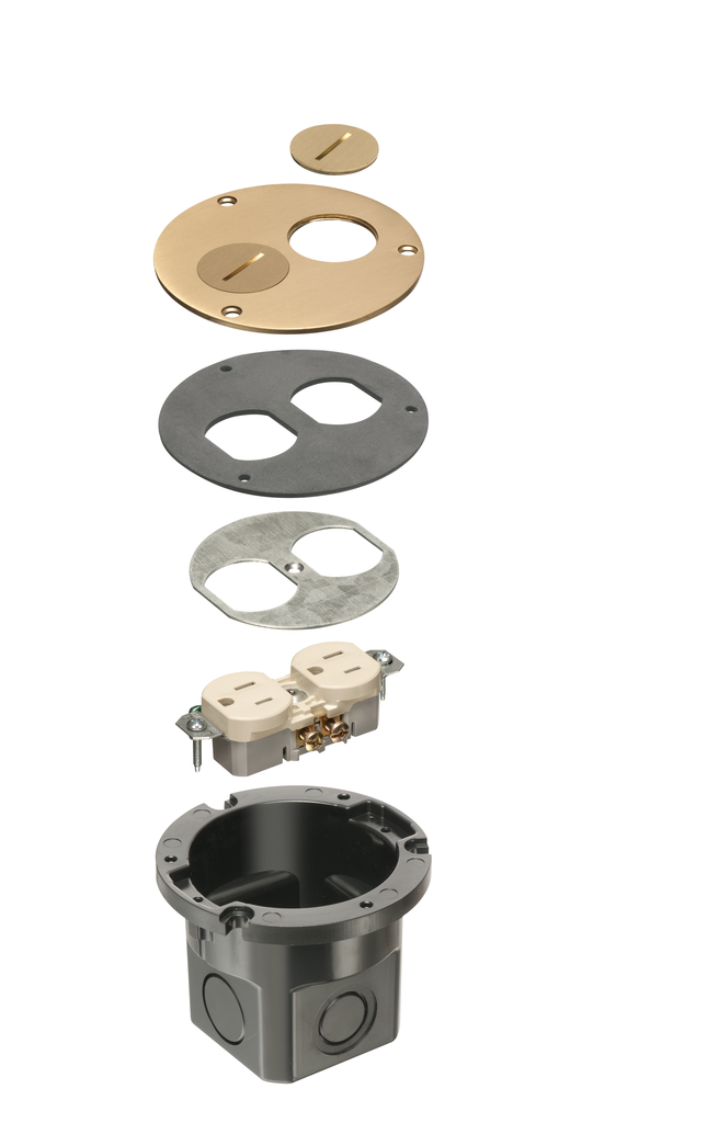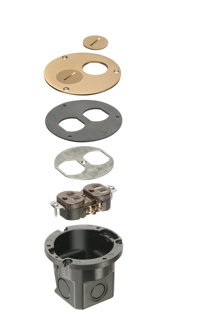 This flush to floor round cut in box kit from Arlington Industries is designed for seamless integration into existing flooring, providing both function and aesthetics. Featuring a brass cover with threaded plugs, it not only offers durability but also a polished look that complements a variety of interiors. The non-metallic construction of the cut-in box ensures it fits smoothly into your space while adhering to cULus listing standards for safety and reliability. Available in additional color options, including nickel, this versatile unit is an excellent choice for any project needing discreet access to electrical connections right at floor level.