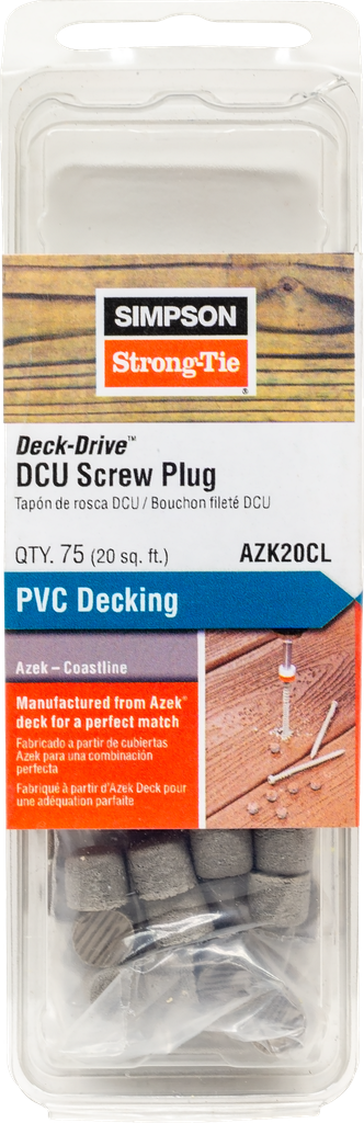 Fastening deck boards and trim can result in visible screws which can distract from the beauty of your outdoor project. The Simpson Strong-Tie® Deck-Drive DCU screw plug solution is a complete Hidden Deck-Fastening System™ designed for use with our premium DCU Composite screws and consists of DCU Composite screws, DCU screw plugs and the Auto-Set Driver™ bit (each sold separately). The DCU screw plugs are made from major composite and PVC board manufacturers’ materials to match your deck and trim boards. No more visible screw heads — a clean, professional finish.