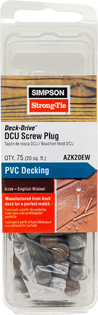The Simpson Strong-Tie Deck-Drive DCU Screw Plug in Azek English Walnut offers an ideal solution for achieving a seamless and polished appearance on your decking projects. Designed specifically for use with Simpson Strong-Tie Deck-Drive DCU Composite screws, these plugs neatly conceal screw heads, enhancing the overall aesthetic while providing a sturdy finish. Crafted from PVC decking material to ensure durability and resistance to weathering, each plug is tapered for effortless insertion. With a precise match to the color and texture of Azek decking, this 75-pack not only simplifies installation but also contributes to the long-lasting quality of your outdoor spaces.