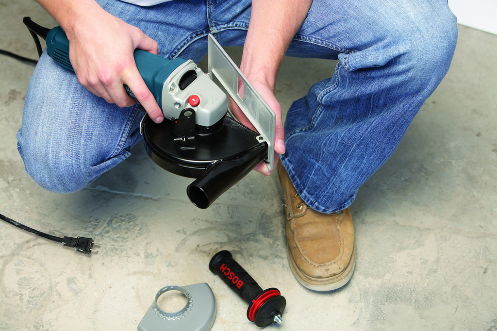 The Dust-Extraction Guard for Bosch 4-1/2 In. and 5 In. Small Angle Grinders is an essential accessory for maintaining a clean and safe workspace. Fitted to work seamlessly with a variety of Bosch small angle grinders, including models from the GWS and AG series, this guard features a flexible design that facilitates efficient dust collection during concrete cutting. The single-screw depth adjustment allows for quick and precise depth settings, ensuring clean and accurate cuts while reducing airborne dust and debris. Engineered with rugged materials to withstand jobsite conditions, this guard includes a large, durable foot plate that enhances stability, making it a reliable choice for professional contractors and DIYers alike. With this dust-extraction guard, you can focus on the task at hand while contributing to a healthier work environment.