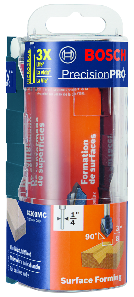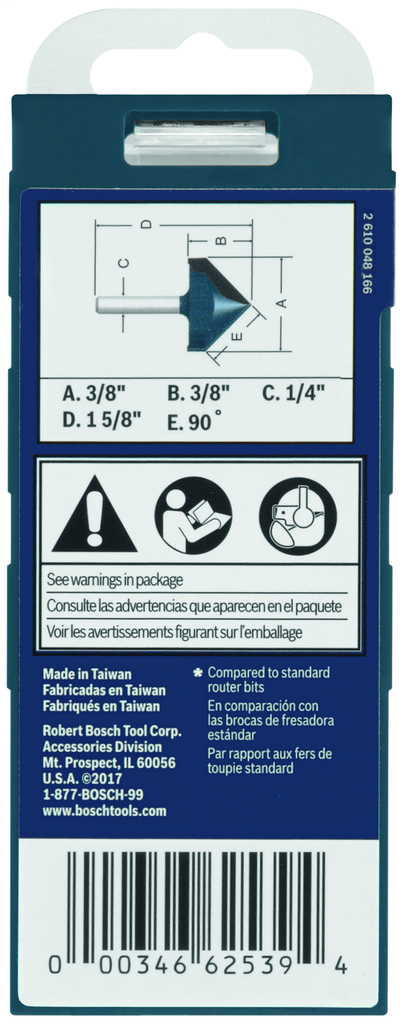 The Bosch 3/8 In. x 7/16 In. Carbide-Tipped V-Groove Router Bit is engineered for precision and durability, making it an essential tool for any woodworking project. Featuring an innovative heat-treating process, this bit is designed to withstand high temperatures while maintaining its hardness, which enhances its overall lifespan. Its shear-angle design enables faster routing and cleaner cuts, especially suited for groove cutting in applications like door-front grooving and sign work.