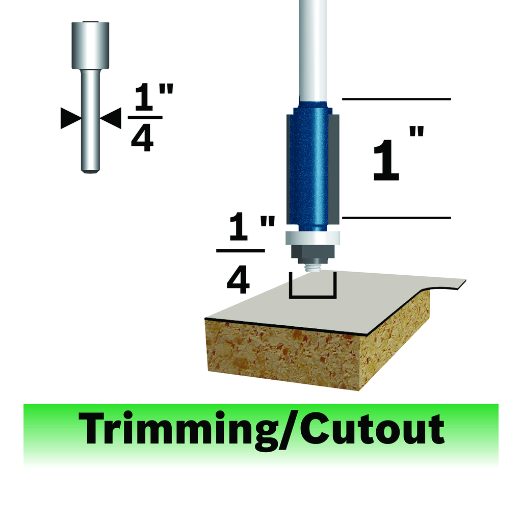Crafted with precision from micrograin carbide tips, this flush trim bit ensures both durability and exceptional performance for a variety of applications. The design allows for fast and smooth flush trim cuts, making it ideal for trimming laminates, veneers, and similar materials. With a control cut design to minimize kickback and a shielded, compact ball-bearing pilot that guides the bit along the edge of the material, users can expect enhanced stability and ease of use during operation. The 1/4 inch shank diameter and 2-flute configuration further contribute to its efficiency, making this tool a valuable addition to any woodworking setup.