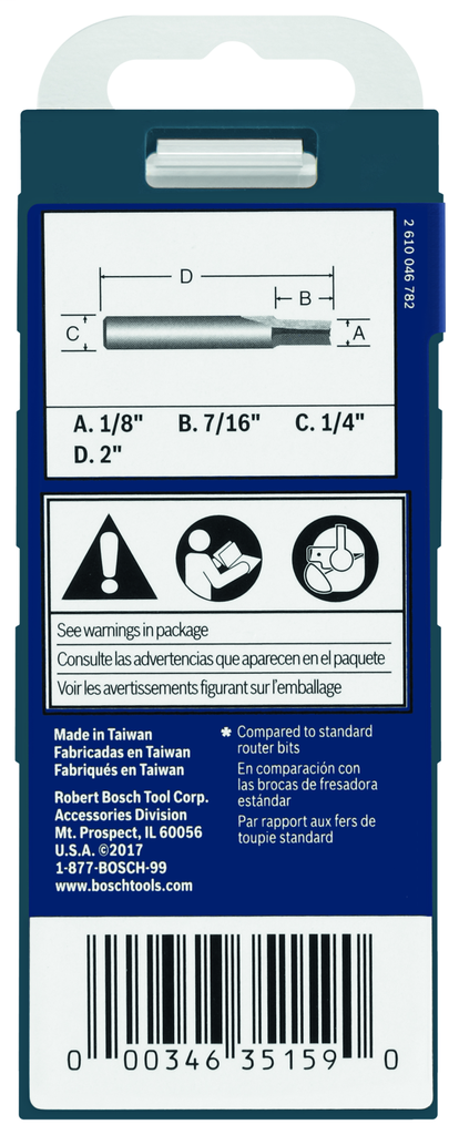 Crafted by Bosch, this 1/8-inch by 1/2-inch solid carbide double-flute straight router bit represents a top-tier choice for woodworking professionals and enthusiasts alike. Designed for versatility, it features a comprehensive line of bit profiles suitable for a variety of applications, including mortising, edge forming, and cabinetry/joinery in wood, plastic, and laminate. The specially engineered micrograin carbide provides exceptional durability and sharpness, ensuring precise cuts and a smooth finish, while the unique heat-treating process allows the bit to withstand high temperatures during demanding tasks. Thanks to its double-flute design, users can also expect improved feed rates and efficient chip removal, making it an indispensable tool for achieving high-quality results in both fine and robust materials.