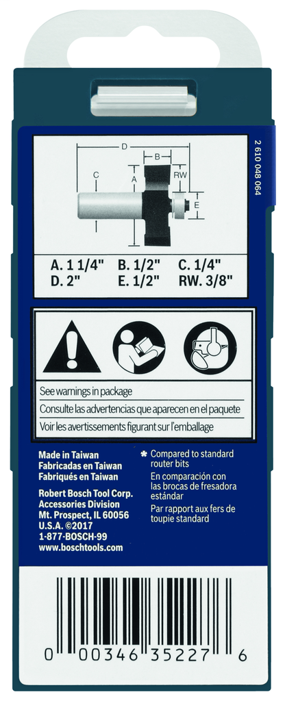Engineered for precision and durability, this carbide-tipped rabbeting router bit from Bosch is an essential tool for creating clean, rabbeted edges on joints, drawer fronts, and various woodworking applications. Its upgraded micrograin carbide design is formulated to deliver consistently smooth cuts while offering superior wear resistance, ensuring a long lifespan even under demanding conditions. The compact ball-bearing pilot allows for effortless guidance along the material’s edge, eliminating the need for a router guide, while the reinforced shank enhances durability and stability during use. With an extensive range of profiles available in Bosch’s comprehensive bit line, this cutting tool is a reliable choice for professionals and hobbyists alike.