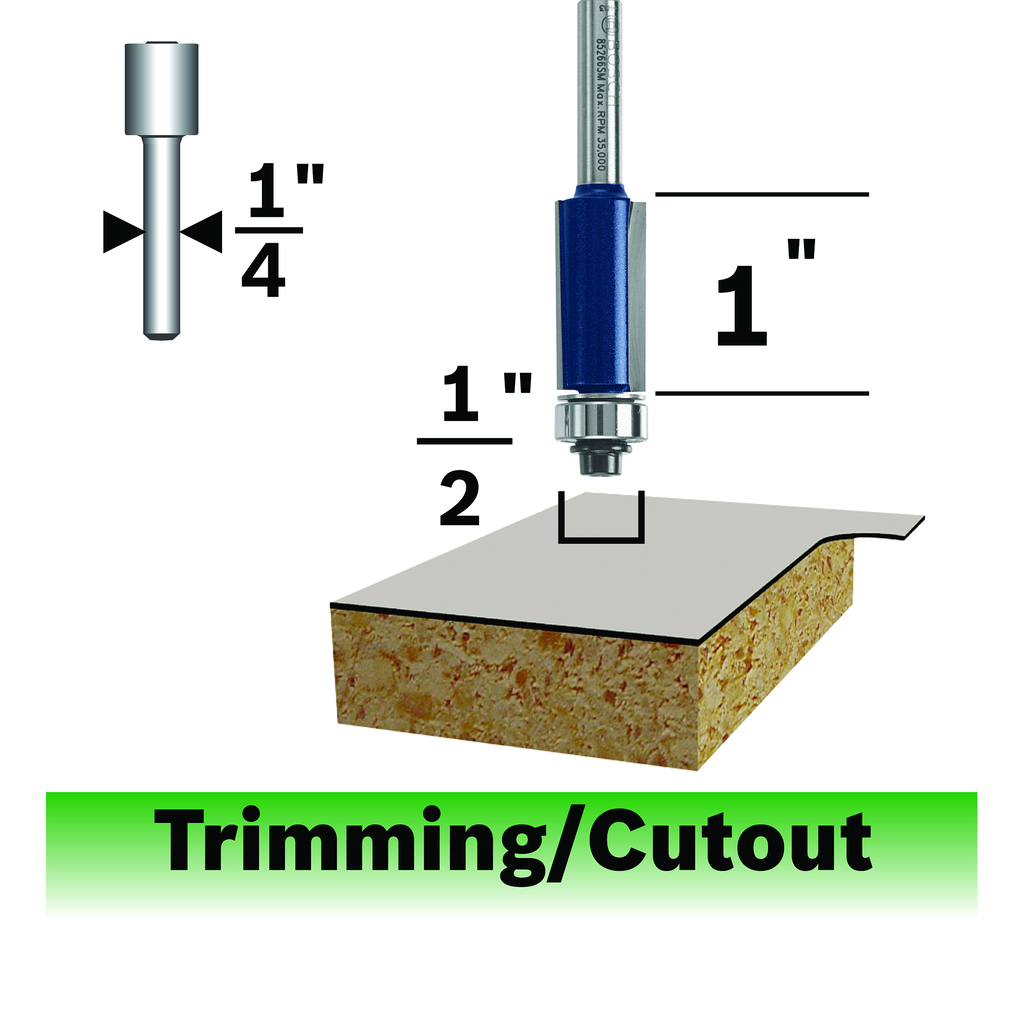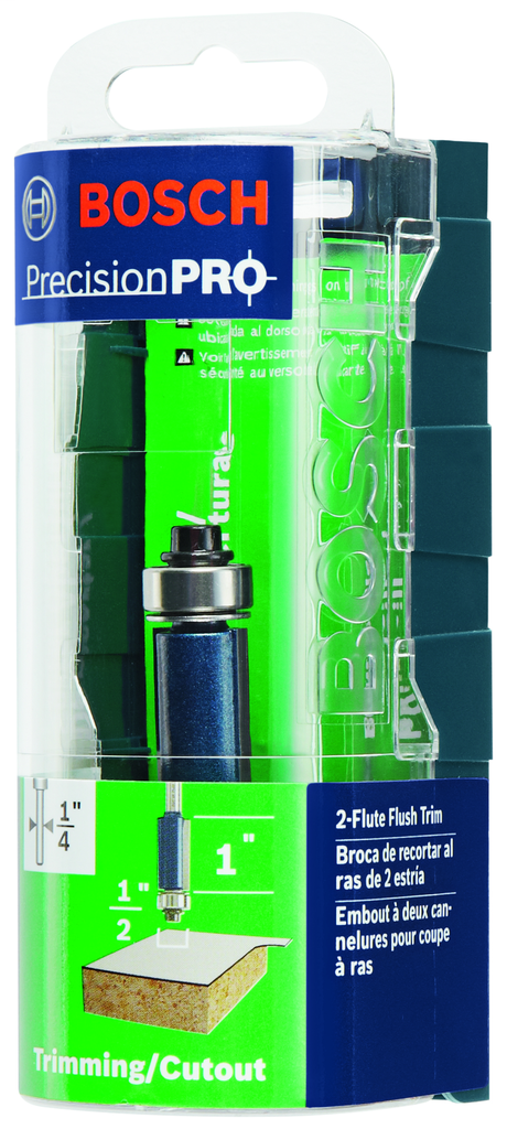 Crafted for precision and efficiency, this carbide-tipped double-flute flush trim router bit from Bosch is an essential tool for any woodworking project. With its innovative design featuring upgraded micrograin carbide, this bit delivers smooth, clean cuts while ensuring exceptional durability and wear resistance. Perfect for trimming laminates and veneers, the bit’s two-flute design allows for faster and smoother processing, making it ideal for everything from cabinetry to edge forming. The reinforced shank is engineered to withstand high temperatures, enhancing the tool’s longevity and performance, ultimately helping you achieve professional results in your woodworking endeavors.