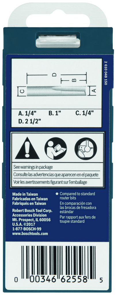 The 1/4 In. x 1 In. Solid Carbide Double-Flute O-Flute Router Bit by Bosch is a versatile tool designed for precision and efficiency in woodworking, plastic fabrication, and laminate projects. Constructed from upgraded micrograin solid carbide, this router bit ensures long-lasting performance while delivering consistently smooth finish cuts, even in challenging materials. Its unique O-flute design enhances chip ejection, allowing for smoother and faster cutting at high speeds, while the double-flute structure improves edge quality, particularly in soft plastics such as ABS and PVC. With a robust build that combines rigidity and superior wear resistance, this router bit is ideal for achieving professional-grade results in cabinetry and joinery applications.