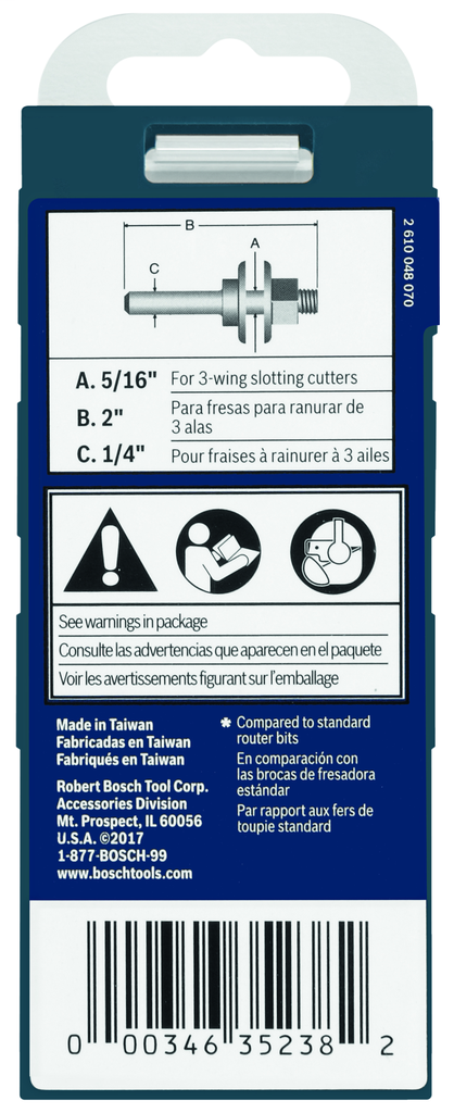 Crafted for durability and precision, the 5/16-inch arbor is specifically designed for use with three-wing slotting cutters, making it an essential component for various routing projects. Its fully hardened and tempered steel shank ensures long-lasting performance, while Bosch’s exclusive heat-treating process enhances hardness and enables it to withstand high temperatures typically faced during intensive tasks. This arbor features a threaded shank design equipped with retainer collars, providing stability during use, and it is perfectly suited for integration with router tables, particularly when paired with a routing guide. With a comprehensive line of compatible bits, it opens up a world of possibilities for mortising, edge forming, trimming, and cabinetry work across wood, plastic, and laminate materials.