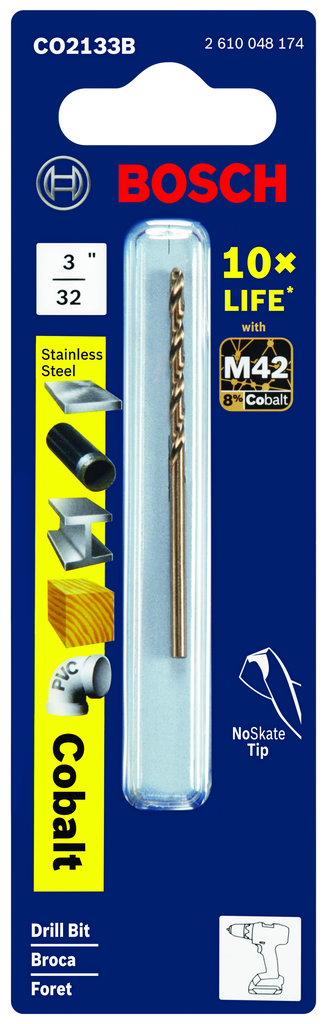 Bosch Cobalt M42 Metal Drill Bits are engineered with upgraded M42 alloy, containing 8% cobalt. These hard-core cobalt bits deliver 10X life vs. standard bits, are jobber length and withstand high-heat applications. The thick web-helix design delivers fast material removal and increased stability. Bits that are 1/8 In. and larger feature a split point; bits 3/16 In. and larger feature a three-flat shank, for better bit grip. These cobalt drill bits provide superior performance in stainless steel and can be used to drill cast iron, titanium and other hard or abrasive metals.