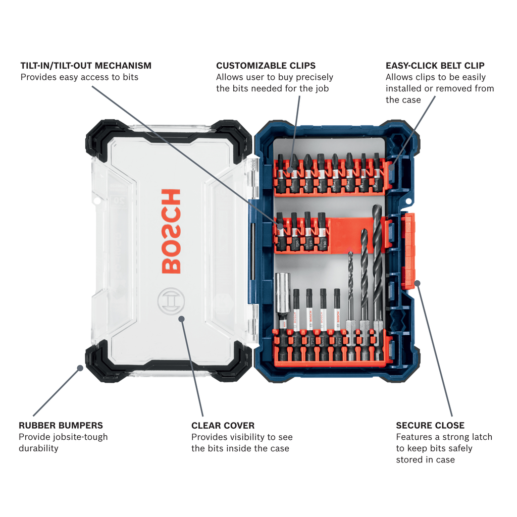 The 20 pc. Impact Tough™ Drill Drive Custom Case System Set from Bosch is expertly crafted for both enthusiasts and professionals seeking efficiency and durability in their drilling projects. Featuring heat-treated bits designed for strength, this comprehensive set includes precision-engineered driver tips that provide a tight fit to minimize cam-out. The custom storage configuration enhances organization, ensuring that the right bit is always within reach, while high-visibility markings simplify the bit selection process. Designed for impact applications, the Impact Tough™ design extends the life of both driver and drill bits, supported by a black oxide coating that reduces friction and heat buildup. Housed in a robust case with a tilt-in/tilt-out mechanism and secure latch, this set not only offers optimal performance but also reliable protection and access to your tools.
