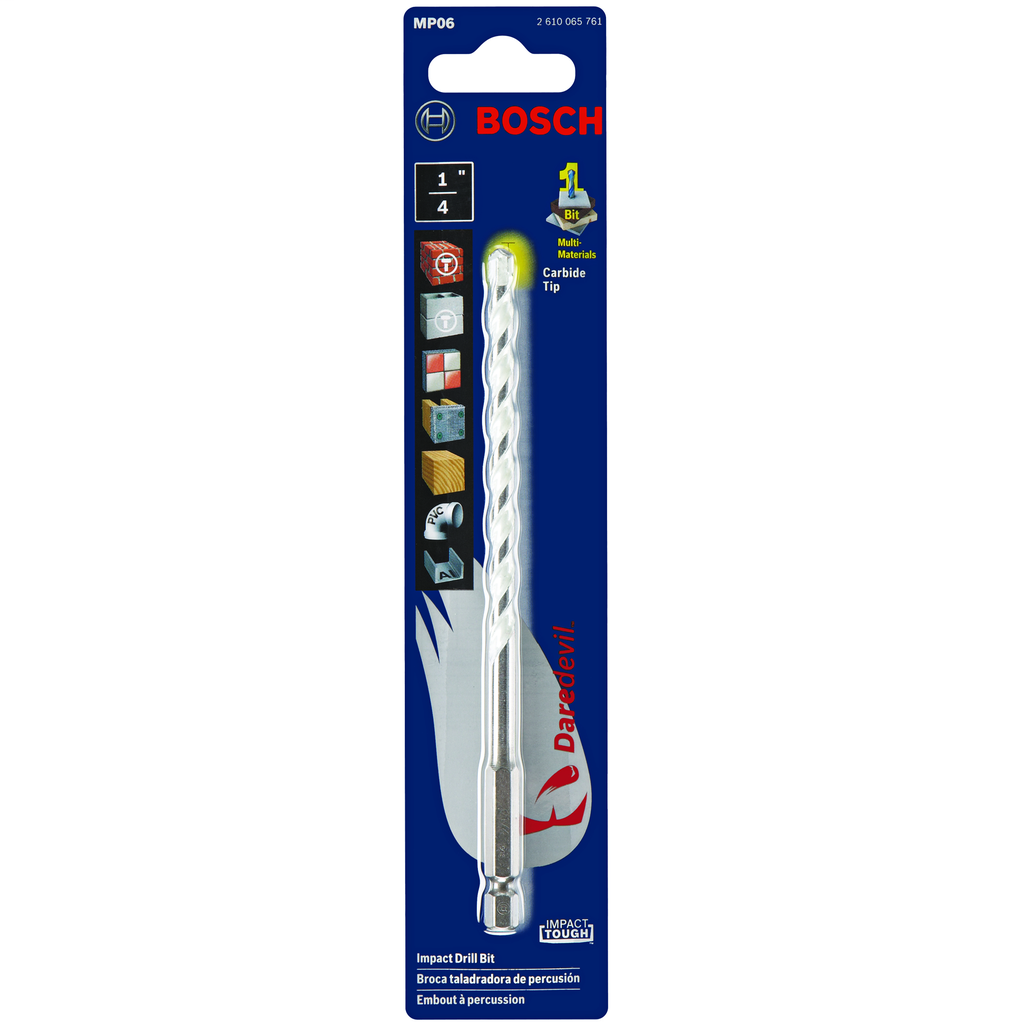 The 1/4 In. x 4 In. x 6 In. Daredevil® Multipurpose Drill Bit by Bosch is engineered for exceptional durability and performance across a wide range of materials. Built with long-life construction, it outlasts standard bits by delivering up to nine times the life in multi-material applications, making it a reliable choice for both professionals and DIY enthusiasts. Its sharp ground cutting edges are designed for advanced drilling capabilities, while the no-skate tip ensures clean, precise holes.