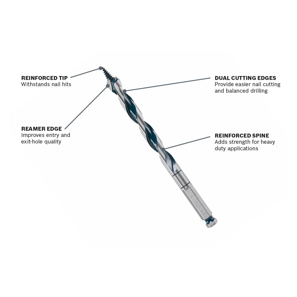 The Bosch Daredevil™ Auger Bits set includes three high-performance bits, each measuring 1-3/8 inches in diameter and designed for efficient wood drilling, particularly in tough conditions. Featuring an open-faced flute, these bits excel at chip removal for smoother operation, while their reinforced tip is built to withstand the rigors of repeated nail impacts, ensuring longevity. The dual cutting edges enhance nail cutting capabilities, while the reamer edge contributes to superior entry and exit hole quality, making these bits a reliable choice for demanding tasks. With a drilling depth of 13.5 inches, they offer impressive versatility for various applications, making them an essential addition to any woodworking toolkit.