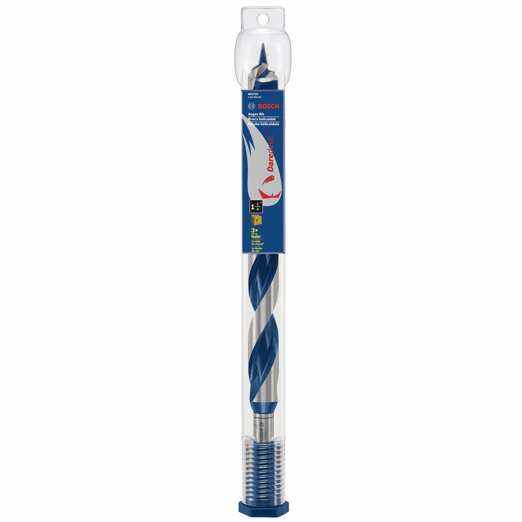 The 1-1/4 In. x 17-1/2 In. Daredevil™ Auger Bits by Bosch are designed for efficient and effective drilling in wood, making them a valuable addition to any contractor’s toolkit. Featuring dual cutting edges for easier nail cutting and a balanced drilling experience, these bits enhance both entry and exit-hole quality thanks to their innovative reamer edge. The tough alloy steel material endows them with a remarkable durability, capable of withstanding repeated nail hits—resulting in a lifespan that is nine times longer than standard bits. Moreover, the open-faced flute design significantly improves chip removal, ensuring a smoother drilling process and reducing the likelihood of bit clogging, making every task simpler and more efficient.
