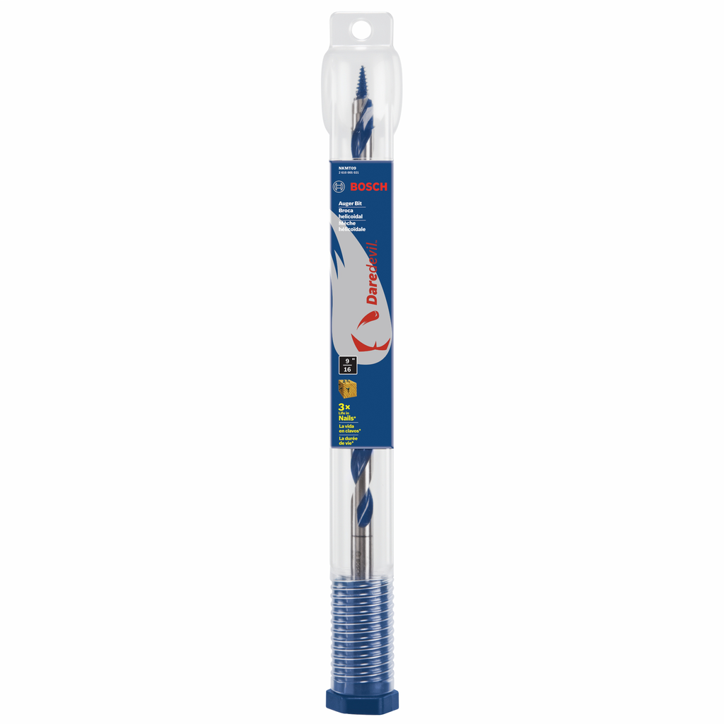 Engineered for durability and performance, the 9/16 In. x 13 In. Daredevil™ Auger Bits from Bosch are ideal for both professional and DIY projects. These bits feature a reinforced tip designed to endure repeated nail hits, ensuring reliability in tough work conditions. The open-faced flute significantly enhances chip removal, while the innovative reamer edge improves the quality of entry and exit holes, providing cleaner results. With dual cutting edges, this auger bit allows for easier nail cutting and demonstrates impressive longevity, offering up to nine times the life when cutting through nails. Designed for easy use in wood, these bits make tough jobs more manageable, promoting efficiency and precision in every drill.