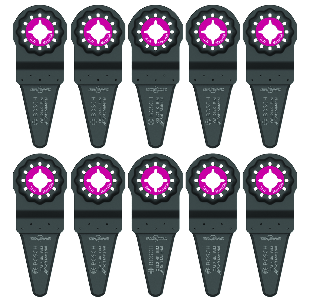 This set of oscillating multi-tool caulk knife blades from Bosch features a tapered design that excels in reaching tight spaces, making it an essential tool for any project requiring precision. Crafted with high-carbon steel, these blades are designed to effectively remove tough sealants, ensuring your work is clean and efficient. The Starlock® interface guarantees compatibility with a variety of professional-grade tools, including those from Bosch, Fein, Milwaukee, Makita, and Rigid, while the color-coded interface along with laser-etched markings help you quickly select the right blade for your task. Each 10-pack combines quality Swiss engineering with versatility, allowing you to tackle a wide range of applications with confidence.