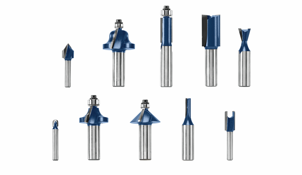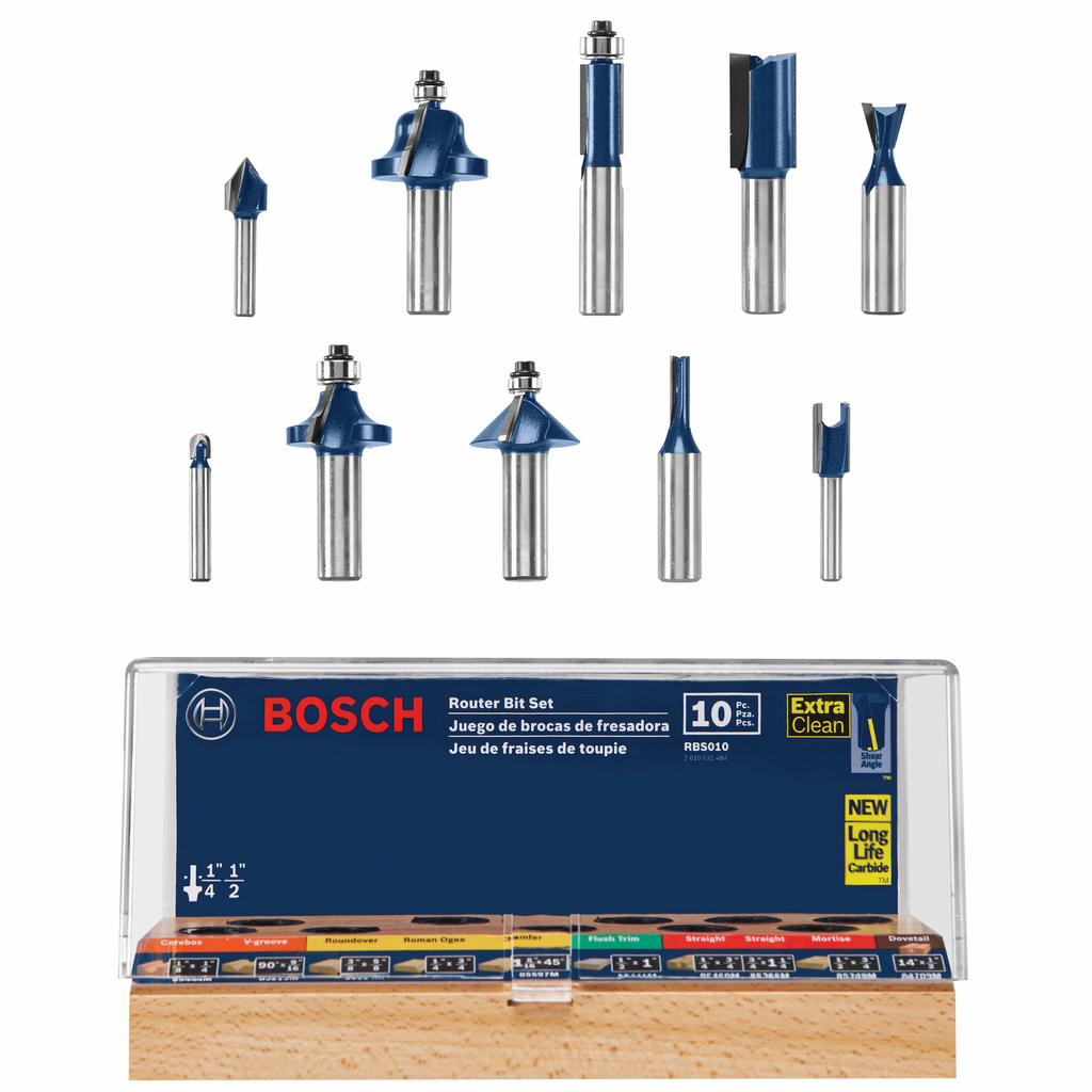 The 10-piece All-Purpose Router Bit Set from Bosch is expertly designed to address a wide range of routing tasks, making it an essential addition to any woodworker’s toolkit. Featuring the most popular profiles, this comprehensive set includes bits for straight cuts, round-overs, dovetails, and even intricate designs like Roman ogees and V-grooves. Each bit is crafted with precision-ground micrograin carbide tips, which ensure sharper edges and a smoother finish while providing superior wear resistance for long-lasting performance.