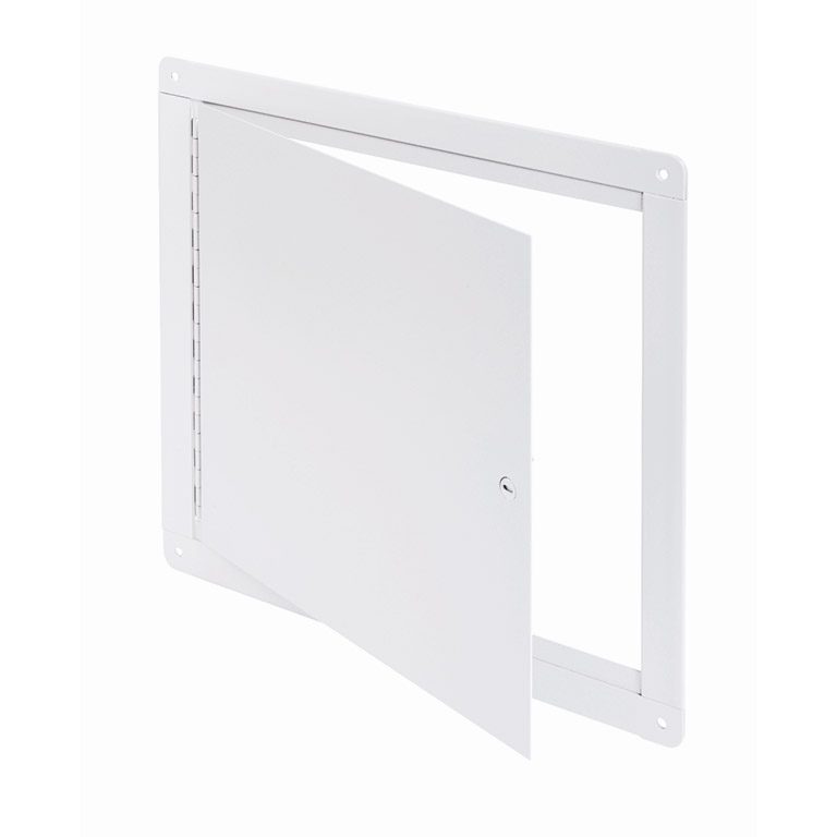 screwdriver operated cam latch, piano hinge; The access panel sits directly on the wall and can be easily installed with fasteners on each corner.