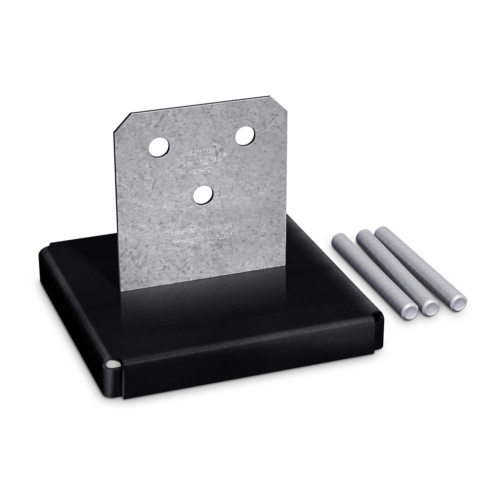The CPTZ post base incorporates a knife plate with a standoff base. It achieves a clean, concealed look while providing a 1 in. standoff height above concrete. The CPTZ is installed with 1/2 in. diameter galvanized pins (supplied).