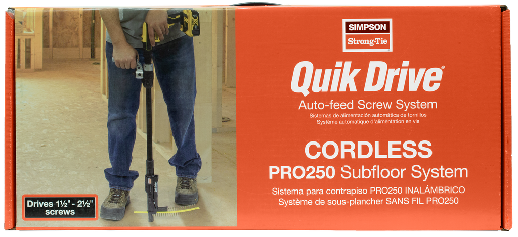 Quik Drive cordless auto-feed screw driving systems are equipped with powerful DeWalt cordless 2000 rpm brushless driver motors and a lightweight extension for efficient and ergonomic stand-up driving. No cords. No trips. No errors. Combined with Simpson Strong-Tie® low-torque fasteners, these cordless Quik Drive systems deliver more screws — faster — per battery charge. This PRO250G2 requires less skill training than traditional installation methods, allowing a first-day apprentice to keep pace with a seasoned veteran.