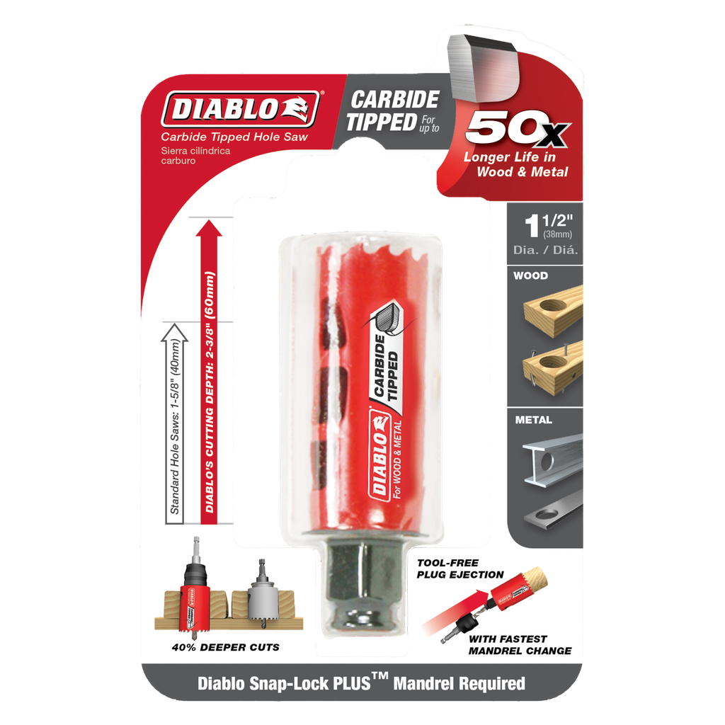 Diablo introduces the first carbide-tipped hole saws on the market to cut both wood and metal (wood, nail-embedded wood, plastic, aluminum, metal, cast iron, stainless steel and metal). Delivering 50 times longer cutting life than bi-metal, these new carbide-tipped hole saws offer faster cutting performance and increased productivity.