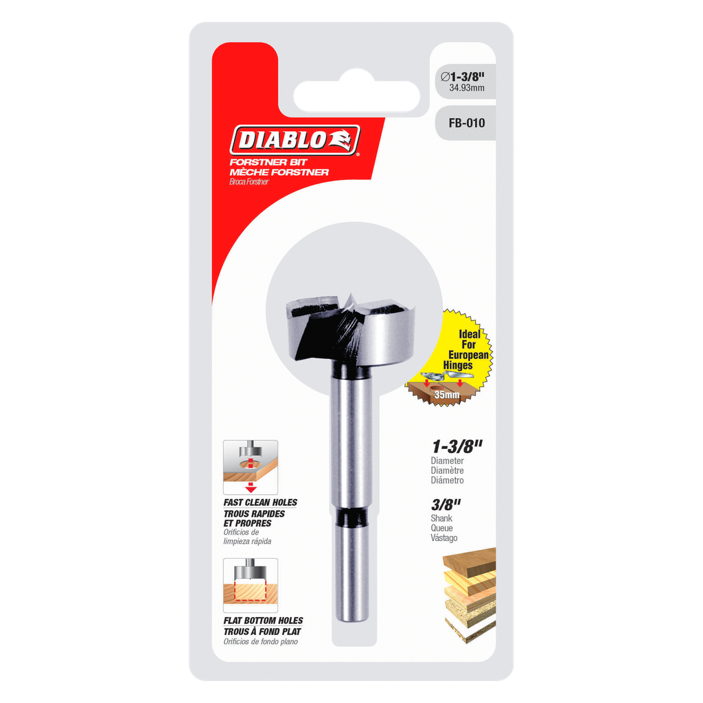 Crafted for precision and efficiency, this Forstner bit from Diablo Tools is an essential addition to your woodworking toolkit. With a diameter of 1-3/8 inches and a 3/8-inch shank, it is designed to drill straight, angled, and overlapping holes in a variety of wood types, including hardwoods, softwoods, veneered plywood, and MDF. The ultra-sharp spur ensures accuracy without the risk of walking on the material, while steep, angled cutting edges produce smooth, flat holes and facilitate quick chip removal in the form of clean curls. Constructed from hardened steel, this bit is built to last, providing a superior cutting edge for all your woodworking projects.