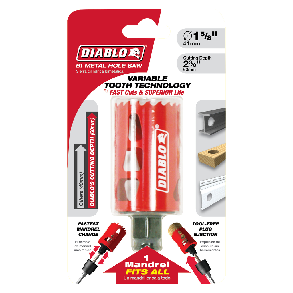 Diablo’s new, high performance hole saws deliver faster cutting performance and increased productivity. Unlike anything on the market, Diablo’s hole saw system and mandrel design simplify the attachment process for fast and efficient hole saw mounting. These radical new hole saws provide ultimate cutting length to bore deeper holes in a single pass, tool-free plug ejection and Variable Tooth Design for faster cuts.