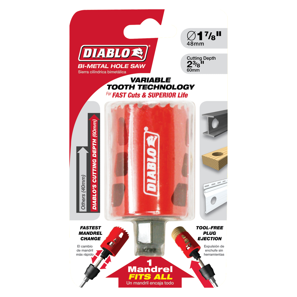 Diablo’s new, high performance hole saws deliver faster cutting performance and increased productivity. Unlike anything on the market, Diablo’s hole saw system and mandrel design simplify the attachment process for fast and efficient hole saw mounting. These radical new hole saws provide ultimate cutting length to bore deeper holes in a single pass, tool-free plug ejection and Variable Tooth Design for faster cuts.