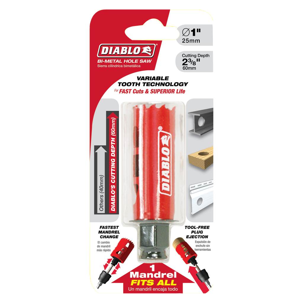 Diablo’s new, high performance hole saws deliver faster cutting performance and increased productivity. Unlike anything on the market, Diablo’s hole saw system and mandrel design simplify the attachment process for fast and efficient hole saw mounting. These radical new hole saws provide ultimate cutting length to bore deeper holes in a single pass, tool-free plug ejection and Variable Tooth Design for faster cuts.