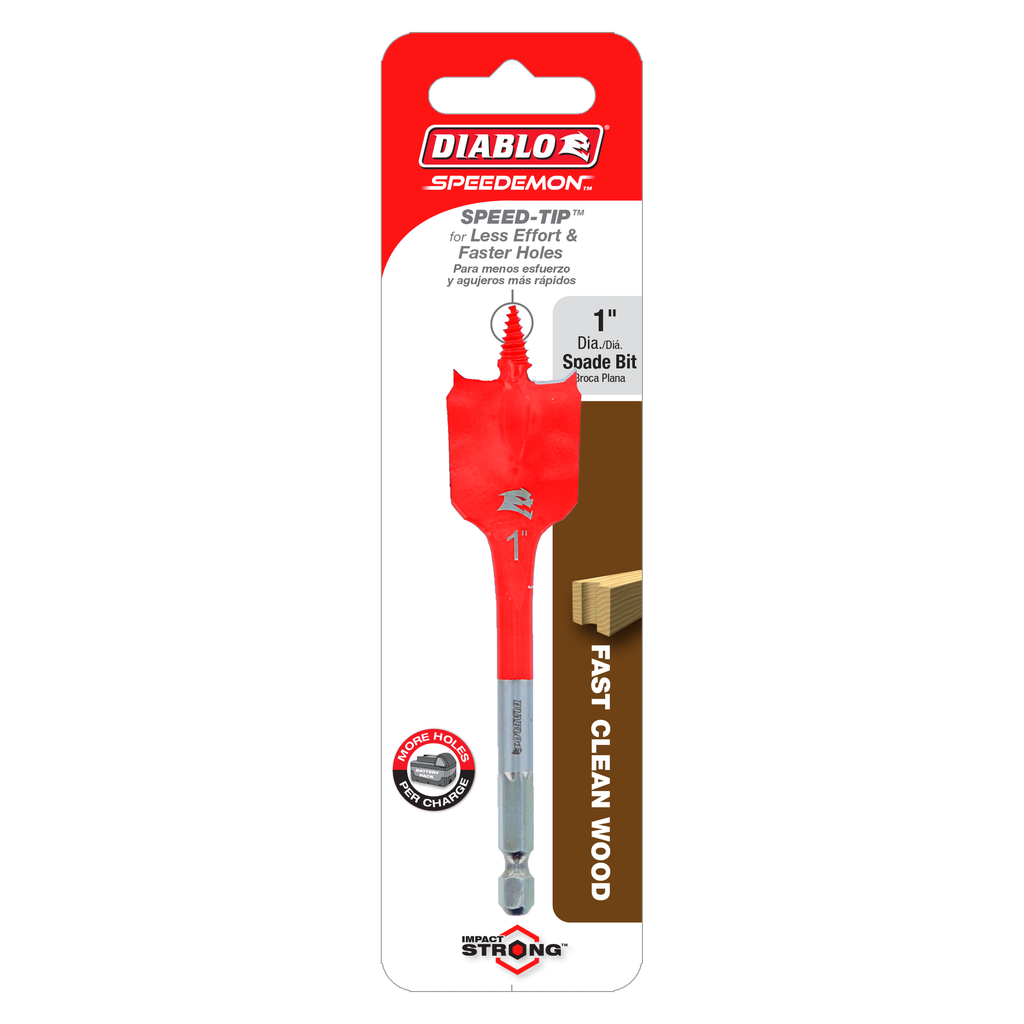 Achieve maximum performance in your woodworking projects with the 1 in. x 4 in. SPEEDemon™ Spade Bit from Diablo Tools. Crafted for both cordless and corded impact and drill drivers, this bit features a SPEED-TIP™ self-feed design that effortlessly pulls the bit into the material, allowing for faster hole creation with minimal effort. The optimized curved paddle design works effectively to remove chip build-up, enabling you to drill more holes per charge, making it ideal for use on hardwoods, plywood, and softwoods alike.