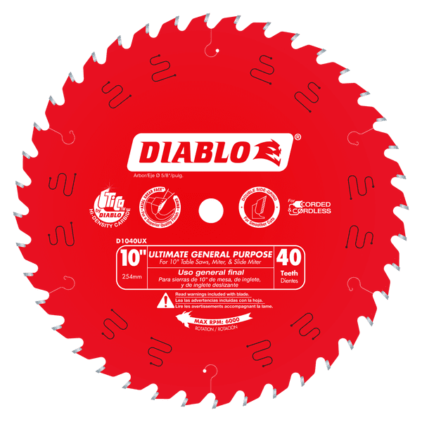 Diablo’s Ultimate General Purpose saw blade is the industry’s most innovative blade for cross-cutting and ripping hardwood and softwood trim and finishes. This technology rich blade includes the ultimate trifecta for creating superior quality cuts that virtually eliminates rework: Hi-ATB tooth geometry for precision, Axial Shear Face Grind for effortless, clean cuts and lastly, a Double Side Grind tooth design for a “polished-like” effect. Diablo made TiCo Hi-Density Carbide is designed specifically to deliver extreme durability and maximum life. This Ultimate General Purpose saw blade has a laser-cut, super thin kerf blade design for fast, effortless cuts on corded and cordless saws making this the go-to blade when working at a permanent location or at a portable jobsite. Use this blade for rip cuts requiring an ultra-smooth finish or make superior crosscuts in solid wood or plywood. Great for both sliding and “chop” style table and miter saws.