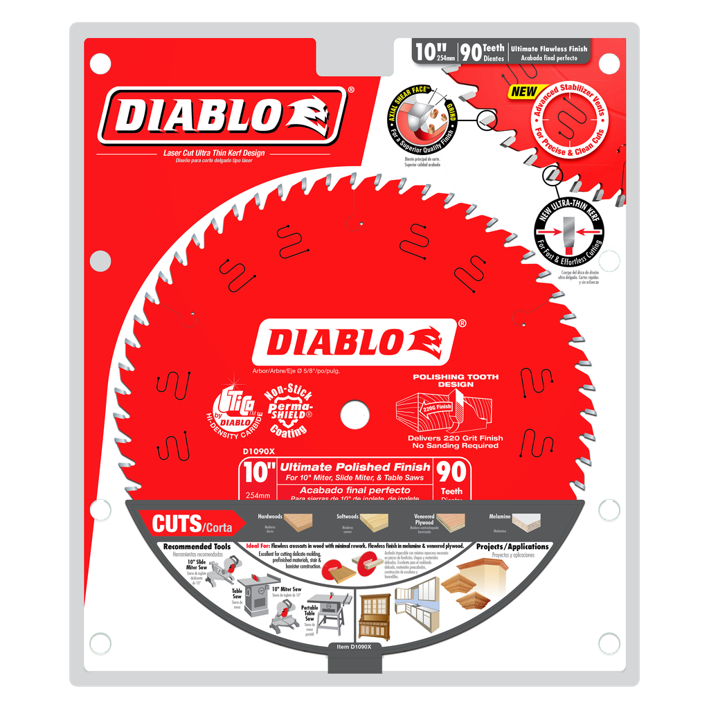 Diablo’s new Ultimate Polished Finish saw blades feature Axial Shear Face Grind (ASFG) that cleanly shears through materials for superior quality finishes on fine molding, hardwoods, softwoods, veneered plywood, melamine and more. Also featuring Double-Side Grind tooth geometry, an incredible 200 additional grinds, this blade produces precise, polished-like cuts equal to that of 220-grit sandpaper or higher. Diablo’s proprietary TiCo Hi-Density Carbide is designed specifically to deliver extreme durability and 5X longer life on materials requiring polished-like finishes. Unlike other blades on the market, Diablo’s Ultimate Polished Finish saw blades have a laser-cut, ultra-thin kerf blade design for fast, effortless cuts on corded or cordless saws making this the go-to blade when working at a permanent location or at a portable jobsite. Diablo’s new Ultimate Polished Finish saw blades are REDefining cutting by introducing radical technology to maximize performance and extend cutting life, saving the PRO both time and money when completing their projects.