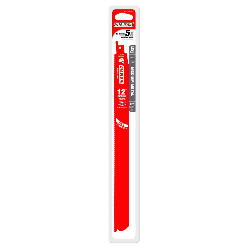 Ideal for tackling a variety of medium metal cutting tasks, this 12-inch bi-metal reciprocating blade set from Diablo Tools provides exceptional performance and durability. Each blade features a unique dual tooth design that combines a double tooth configuration with small gullets, ensuring faster material removal while minimizing vibration for straighter cuts. The Perma-shield coating enhances longevity by protecting against heat, gumming, and corrosion, allowing for extended use without compromising quality. With a full contact arched design, these blades incorporate more working teeth within the material for quicker cuts and reduced heat build-up, delivering up to five times longer cutting performance across medium metals ranging from 1/16 to 5/16 inches thick. Perfect for angle and tubing applications, this five-pack is a reliable choice for professionals and DIY enthusiasts alike.