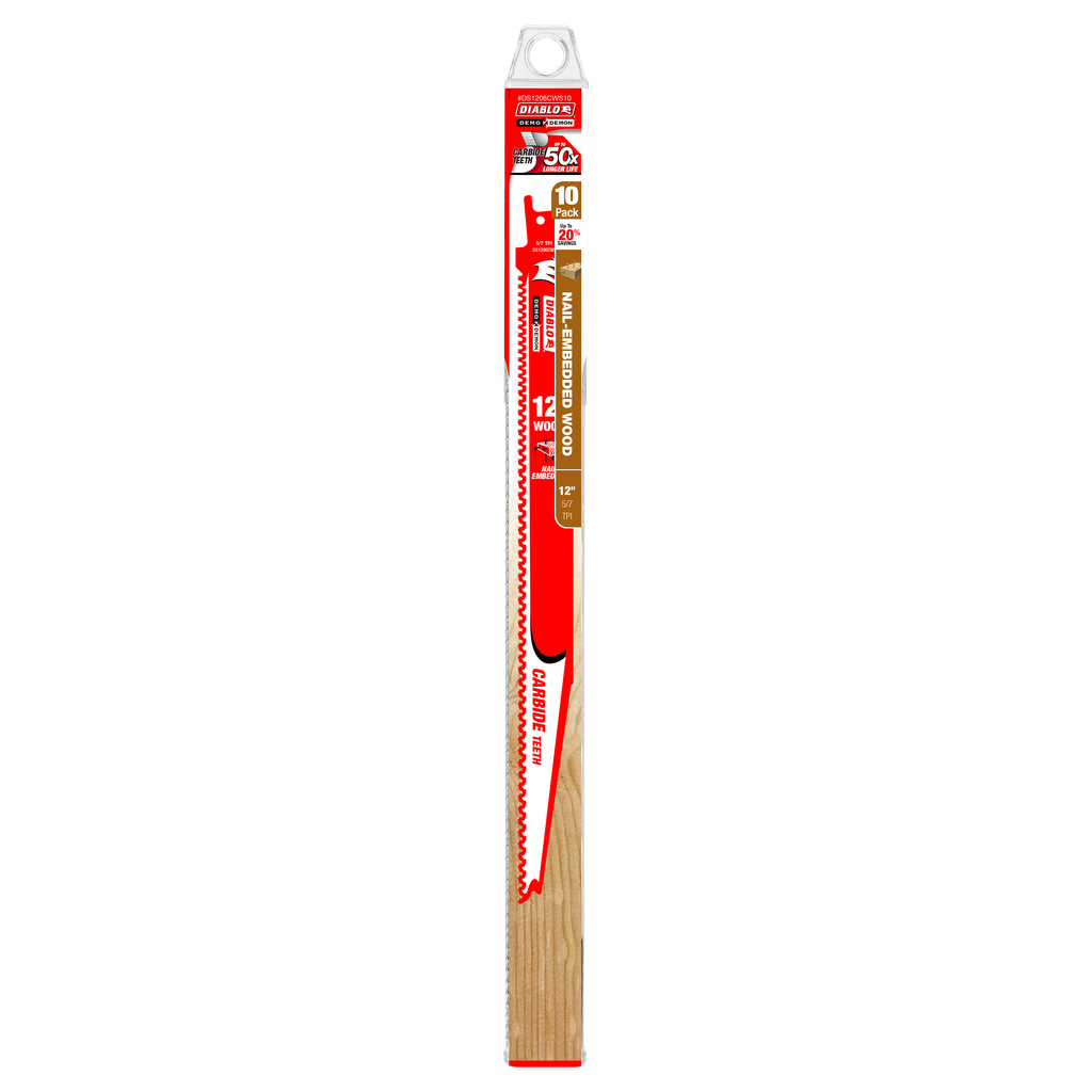 The Next Generation Diablo Demo Demon Carbide-tipped reciprocating blades with new Variable Tooth Design are specifically designed for maximum performance in nail-embedded wood. This high performance carbide-tipped blade delivers unmatched 50 times longer cutting life than bi-metal blades in nail-embedded wood.