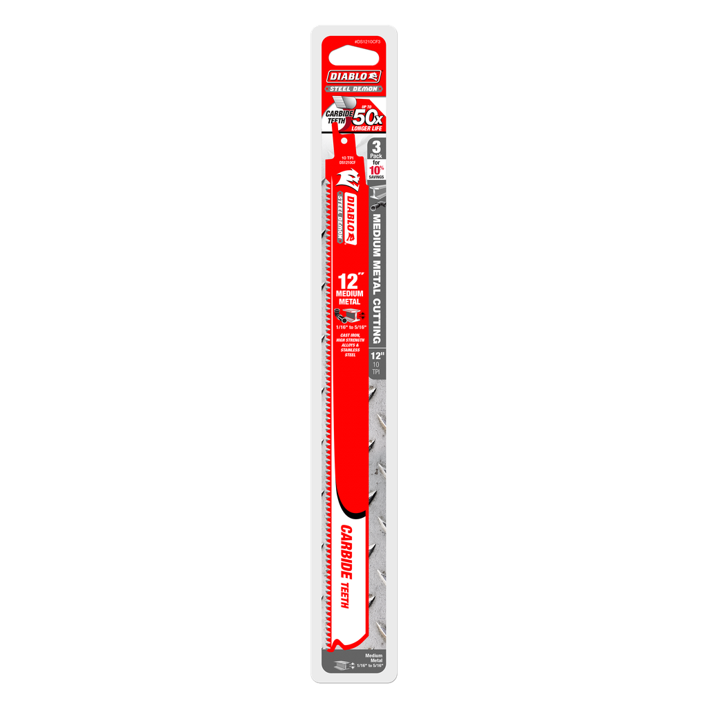Featuring advanced engineering from Diablo Tools, these 12-inch Steel Demon Carbide Recip Blades are specifically designed for cutting medium metals ranging from 1/16 inch to 5/16 inch. Each blade is crafted with high-performance carbide technology that enhances durability and provides exceptional cutting performance, ensuring clean, smooth finishes thanks to a thoughtful 10 TPI tooth geometry. The oversized blade body contributes to straighter cuts while minimizing vibration, making these blades ideal for tackling various materials such as stainless steel, cast iron pipe, and tubing. With a convenient pack of three, these blades are essential for any professional or DIY enthusiast looking to achieve precision in their metal cutting tasks.