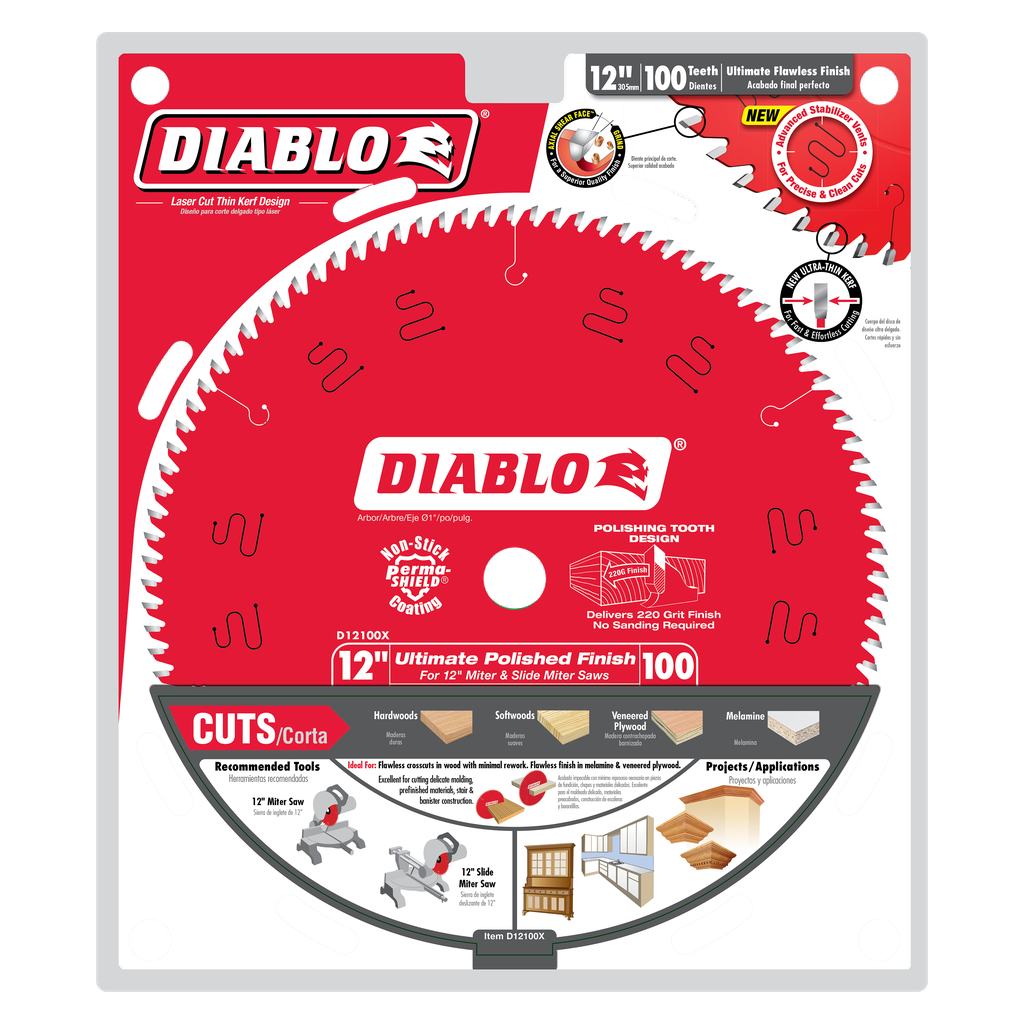 Diablo’s new Ultimate Polished Finish saw blades feature Axial Shear Face Grind (ASFG) that cleanly shears through materials for superior quality finishes on fine molding, hardwoods, softwoods, veneered plywood, melamine and more. Also featuring Double-Side Grind tooth geometry, an incredible 200 additional grinds, this blade produces precise, polished-like cuts equal to that of 220-grit sandpaper or higher. Diablo’s proprietary TiCo Hi-Density Carbide is designed specifically to deliver extreme durability and 5X longer life on materials requiring polished-like finishes. Unlike other blades on the market, Diablo’s Ultimate Polished Finish saw blades have a laser-cut, ultra-thin kerf blade design for fast, effortless cuts on corded or cordless saws making this the go-to blade when working at a permanent location or at a portable jobsite. Diablo’s new Ultimate Polished Finish saw blades are REDefining cutting by introducing radical technology to maximize performance and extend cutting life, saving the PRO both time and money when completing their projects.