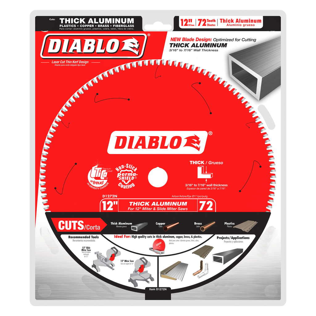 Diablo’s next generation Aluminum saw blades are optimized for cutting thin (up to 1/8”), medium (3/32”-1/4”) and thick (3/16”-7/16”) aluminum metals. Featuring the new, specially formulated Diablo TiCo™ Super-Density Micro-Grain Carbide, these radical blades withstand impact, reduce wear, provide clog free cuts and last longer than standard carbide in metal cutting applications. The specially formulated metal cutting carbide teeth feature a Triple Chip Grind (TCG) Tooth Design for clean, burr-free finishes, virtually eliminating any type of rework. Tri-Metal Shock Resistant Brazing allows these Aluminum blades to slice through metal materials while withstanding extreme impact for maximum durability. Diablo’s Aluminum saw blade series is ideal for corded and cordless saws when on-the-job cutting non-ferrous metals such as aluminum extrusions, copper pipe, brass plate, etc.