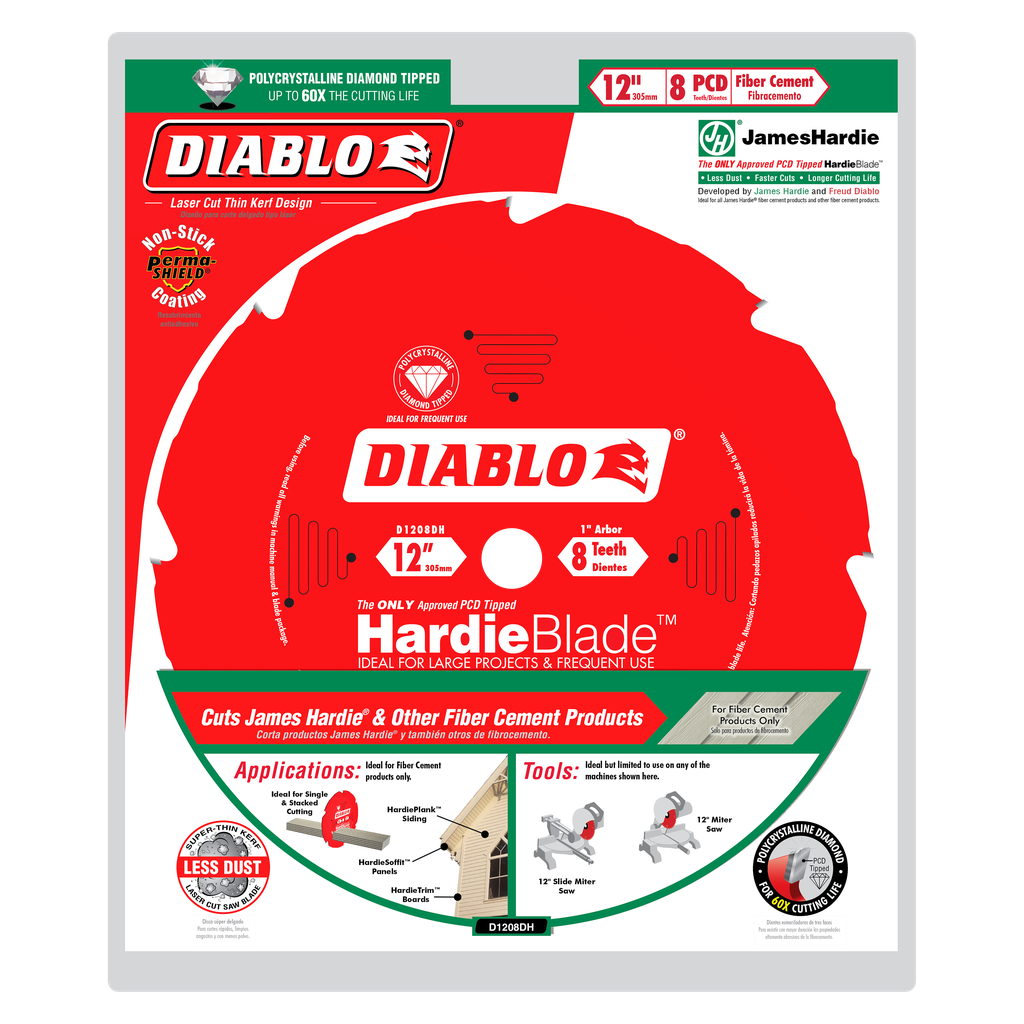 Diablo HardieBlade™ is the only approved PCD (PolyCrystalline Diamond) tipped fiber cement blade recommended by James Hardie Building Products. Diablo Fiber Cement Blades generate up to 50% less respirable dust, while delivering the longest life in all fiber cement materials. Diablo PCD Hardieblades feature a unique, spark-eroded Triple Chip grind for long life – up to 60 times the life in fiber cement of conventional carbide blades Diablo PCD Hardieblades are perfect for full time use in heavy duty applications like cutting multiple pieces of fiber cement board. Dust generation does not necessarily correlate directly to exposure risk.