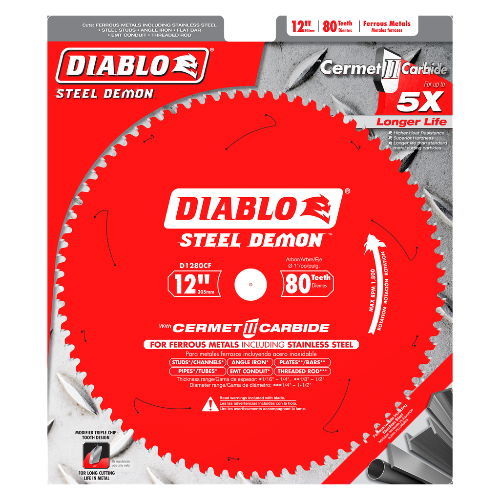 Diablo’s new Steel Demon Cermet saw blade series is redefining metal cutting, and the jobsite, by introducing safer, exclusive innovation that allows users to cut both mild and stainless steels for 40X longer life versus standard carbide-tipped metal cutting saw blades. The specially formulated Cermet (Ceramic and Metallic) teeth provide high heat tolerances and increased hardness for superior wear and ultimate cutting life. Featuring a special Triple Chip Grind and Perma-Shield coating, these blades slice through the toughest of metals to produce precise cuts with less sparks and burr-free finishes that require no rework. The thin-kerf body and advanced laser cut anti-vibration stabilizer vents reduce vibration and noise to allow the blades to quickly shear through metal with ease and accuracy. The ability to cut through both mild and stainless steel eliminates the need for individually dedicated saw blades, offering a one-blade solution for ultimate metal cutting performance and unmatched value story, forever changing the metal cutting industry.