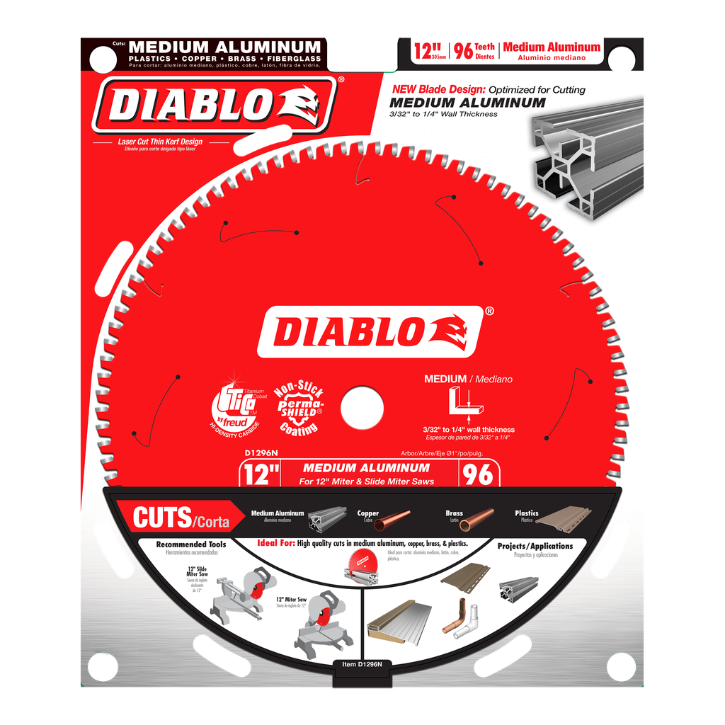 Diablo’s next generation Aluminum saw blades are optimized for cutting thin (up to 1/8”), medium (3/32”-1/4”) and thick (3/16”-7/16”) aluminum metals. Featuring the new, specially formulated Diablo TiCo™ Super-Density Micro-Grain Carbide, these radical blades withstand impact, reduce wear, provide clog free cuts and last longer than standard carbide in metal cutting applications. The specially formulated metal cutting carbide teeth feature a Triple Chip Grind (TCG) Tooth Design for clean, burr-free finishes, virtually eliminating any type of rework. Tri-Metal Shock Resistant Brazing allows these Aluminum blades to slice through metal materials while withstanding extreme impact for maximum durability. Diablo’s Aluminum saw blade series is ideal for corded and cordless saws when on-the-job cutting non-ferrous metals such as aluminum extrusions, copper pipe, brass plate, etc.