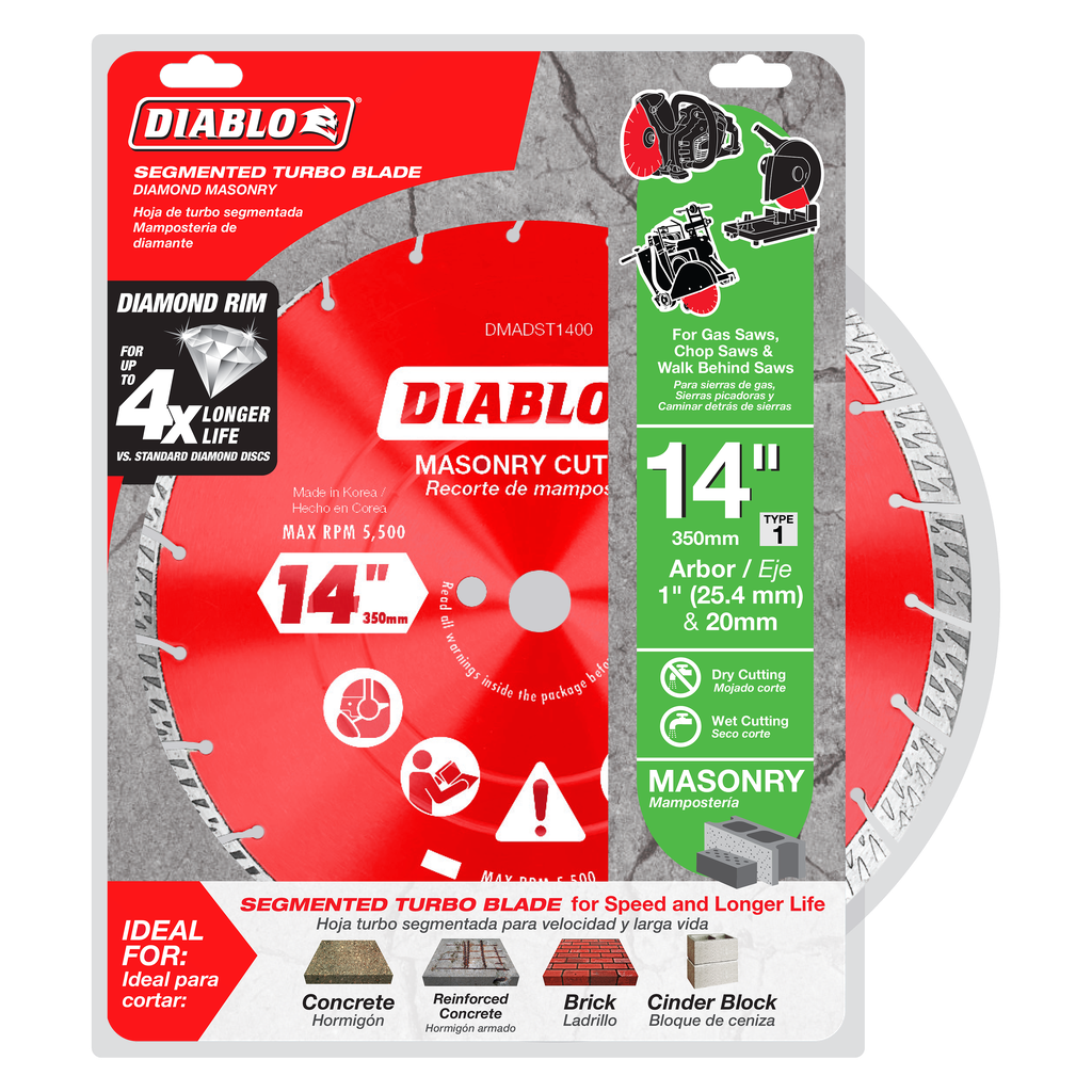 Diablo’s diamond segmented turbo rim masonry cut-off discs provide extreme durability, faster cuts and longer life in concrete, concrete with rebar, brick and cinder block. These diamond rimmed discs deliver up to 30% faster cuts versus standard diamond cut-off discs. The disc’s industrial-grade diamonds with hardened disc body delivers lasting durability and maximizes cutting quality in hardened materials even in extreme applications.