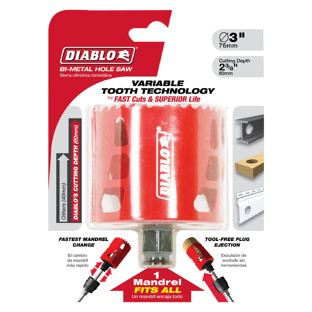 Diablo’s new, high performance hole saws deliver faster cutting performance and increased productivity. Unlike anything on the market, Diablo’s hole saw system and mandrel design simplify the attachment process for fast and efficient hole saw mounting. These radical new hole saws provide ultimate cutting length to bore deeper holes in a single pass, tool-free plug ejection and Variable Tooth Design for faster cuts.