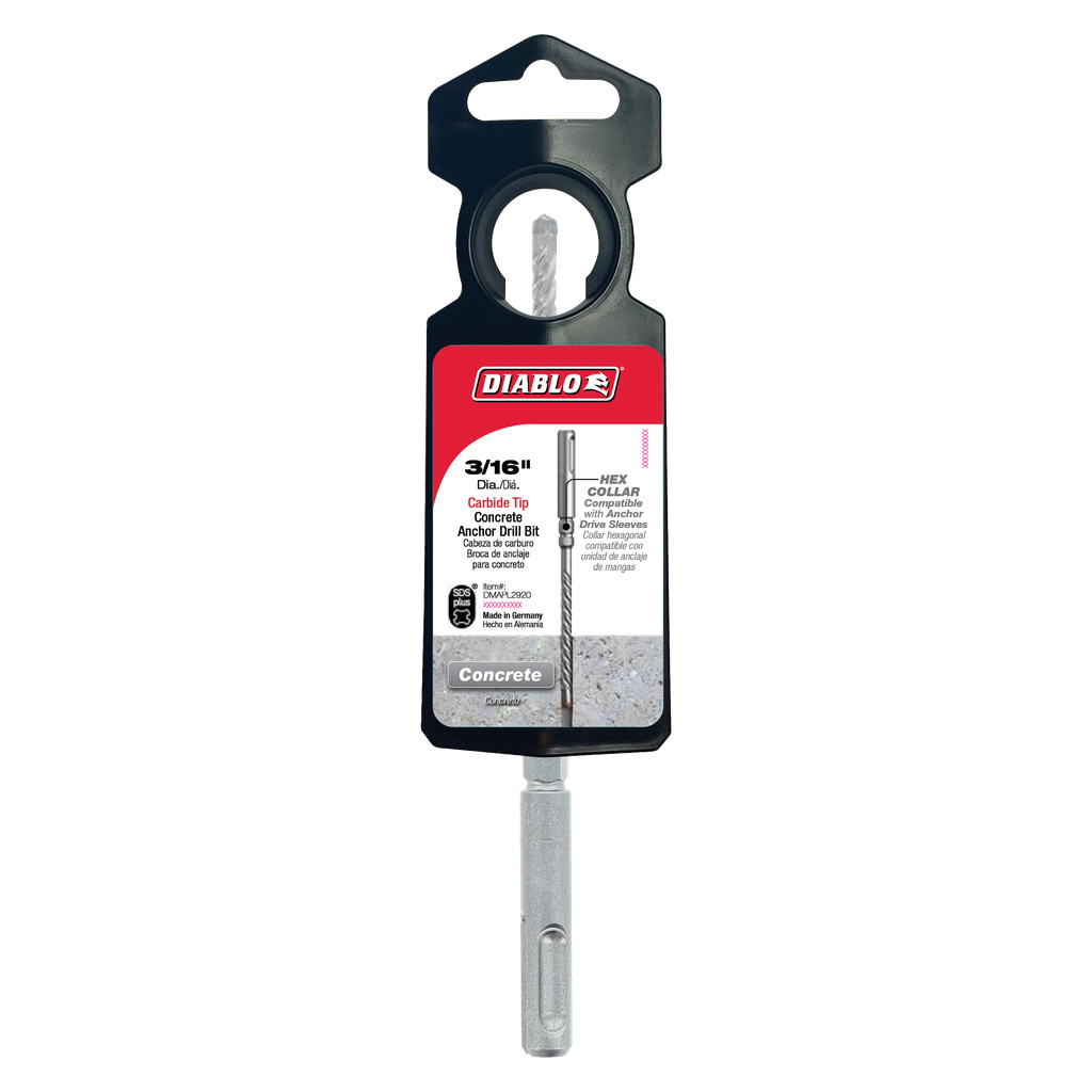 Diablo’s SDS-Plus 4-cutter full-carbide head concrete anchor hammer drill bits are one of the strongest, most durable, and fastest tapcon installation bits. Diablo’s full-carbide head bits withstand the stress of high-powered hammer drills and the impact of rebar cutting, delivering extreme durability and strength. Produced with Tri-Metal Diffusion Bonding technology, the full-carbide head resists heat and prevents breakage for maximum life and productivity. Precision Tip delivers the stability and accuracy required to produce fast, precise holes in concrete with rebar for anchor setting. Optimized for maximum performance in corded and cordless SDS-Plus rotary hammers.
